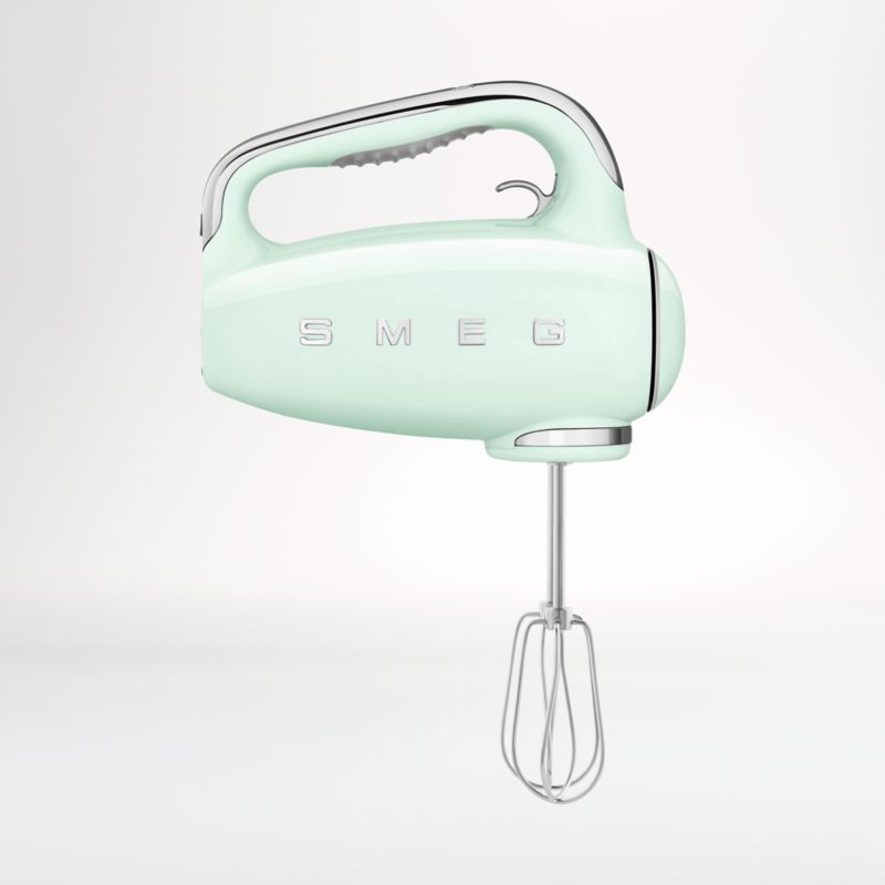 Whip, whisk, blend and knead in sweet retro style with this handheld mixer from Smeg. With its charming curves, stainless steel accessories and chrome details, the glossy pastel green mixer is a delight to work with. The backlit white LED display shows the current mixing speed and the count-up timer, then disappears into the chrome control panel when not in use. Fitted with a soft-touch grip, ergonomic handle and Smooth Start system, the hand mixer provides a comfortable experience as you whip meringue, mix cookie dough and knead bread dough.