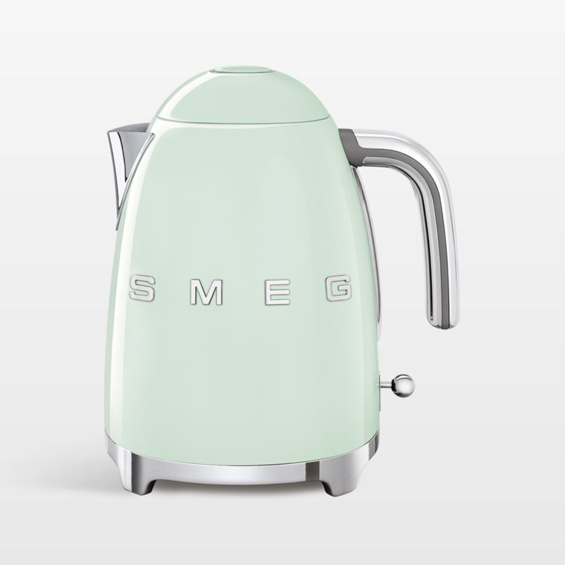 Known for their wonderfully retro refrigerators, SMEG has launched a joyfully designed kitchen appliance collection based on the curved and compact lines of postwar design. Incorporating a 1950s-era aesthetic, SMEG's nod to the past is the star of today's kitchen, incorporating all the current advances in technology. With its charming bullet shape and fun chrome metal accents, the minty green kettle goes beyond basics with a soft-opening lid to manage steam release and a swivel base that goes full circle.