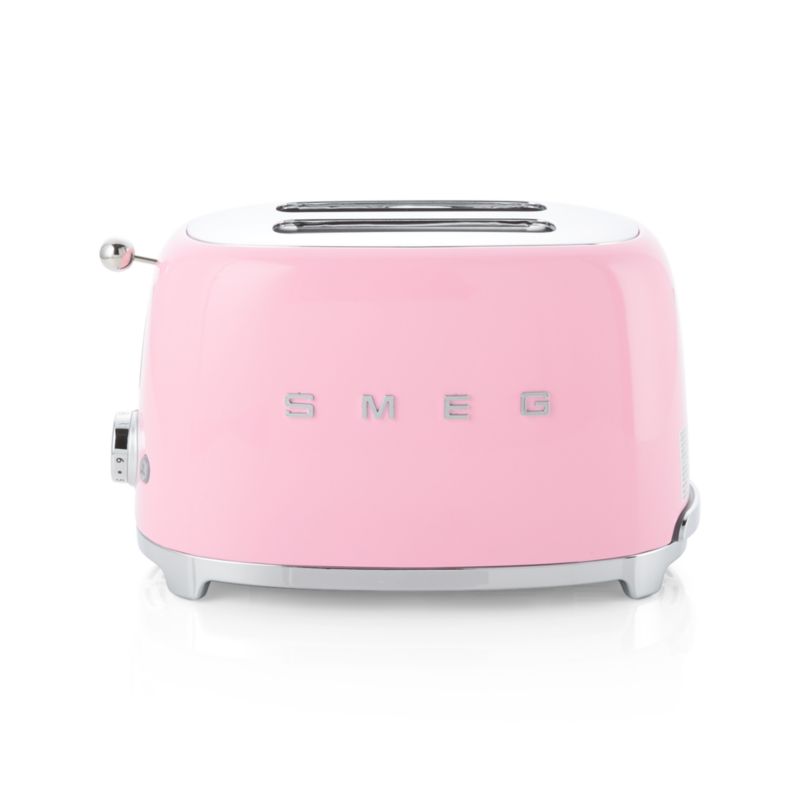 Enameled in pink and accented with a charming ball lever knob, this retro two-slice toaster browns bread, bagels and more at six levels with three convenient pre-set programs. Two extra-wide slots accommodate different slice widths, and self-centering racks ensure even toasting.
