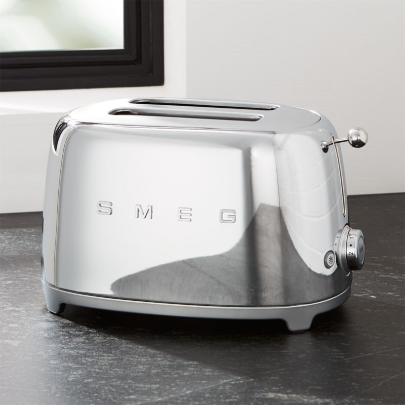 Finished in polished chrome and accented with a charming ball lever knob, this retro four-slice toaster browns bread, bagels and more at six levels with three convenient pre-set programs. Two control panels ensure everyone's toast is done to their specifications. Four extra-wide slots accommodate different slice widths, and self-centering racks ensure even toasting.