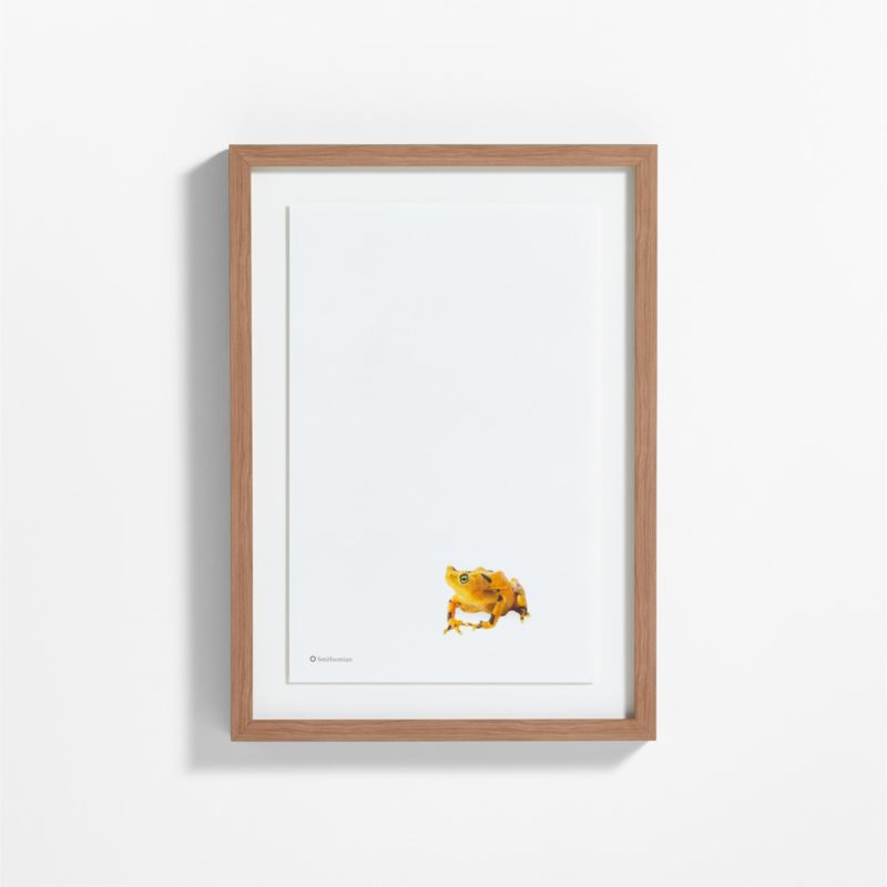 Complete their bedroom or playroom with our fierce yet friendly amphibian print. The framed giclée photo captures the critically endangered Panamanian golden frog—adorably upturned snout and all—in vivid detail. Its distinctive color pops against a white backdrop. The rainforest-dwelling golden frog is actually a toad, and is also Panama's national animal.