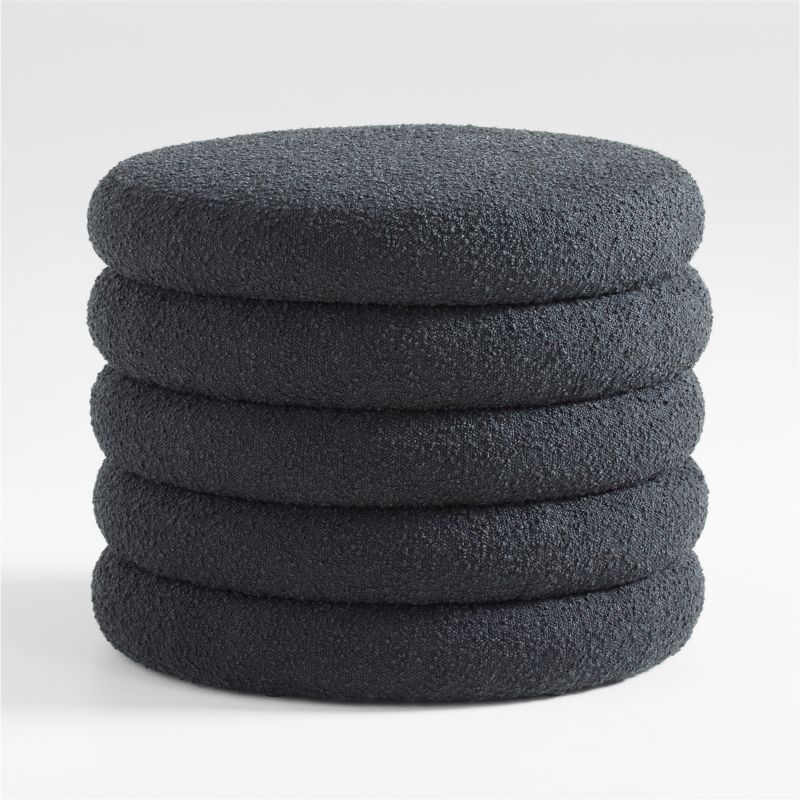 Store favorite toys and beloved blankies in style with this storage ottoman from Leanne Ford. Designed with deep, exaggerated channels for a playfully stacked look, the versatile piece offers extra seating, hidden storage and a place to rest tired feet. Upholstered in family-friendly charcoal grey bouclé , the ottoman opens easily with a lift-off top. To create a snuggly spot for reading, feeding and rocking to sleep, pair the Snoozer charcoal bouclé storage ottoman with the coordinating swivel glider.