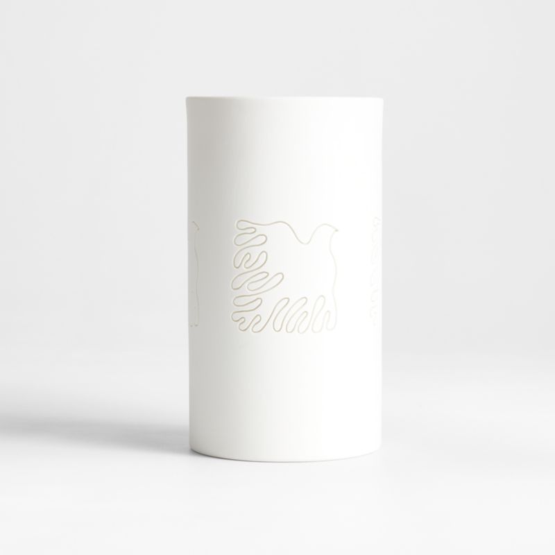 The curvy cutout on our white ceramic candle holder represents one of Lucia Eames' most iconic emblems—a playful experiment with type that makes a graceful graphic out of the word "joy." Made of white-glazed porcelain, the cylindrical hurricane casts a soft glow and a peek at a flickering candle's flame. Pair the small candle holder with the coordinating large and medium Soaring Dove hurricanes.