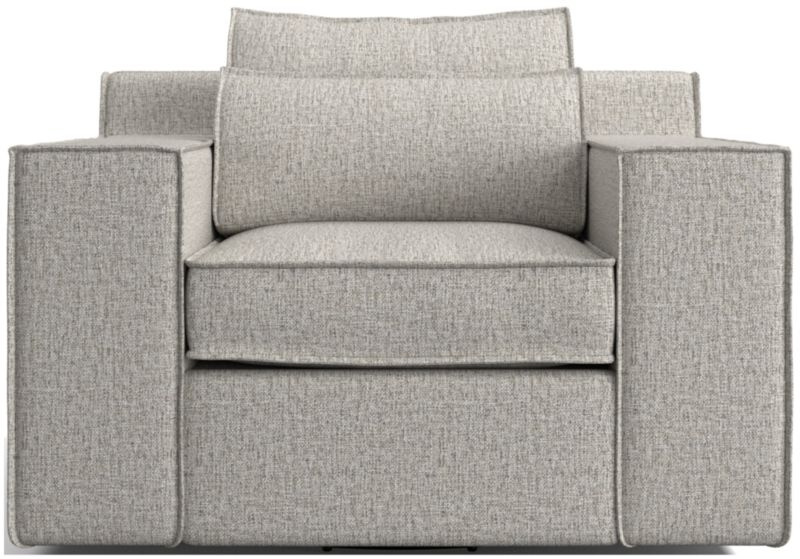 Designed to be tailored and inviting, Soho balances clean lines with softness you can really sink into. Allover flange detailing outlines the swivel chair's modern silhouette, highlighting the wide track arms, box seat cushion and the subtle triangular shape of the back pillows. The lumbar cushion customizes your comfort, creating a double layer of back support or removing for a deeper sit.
