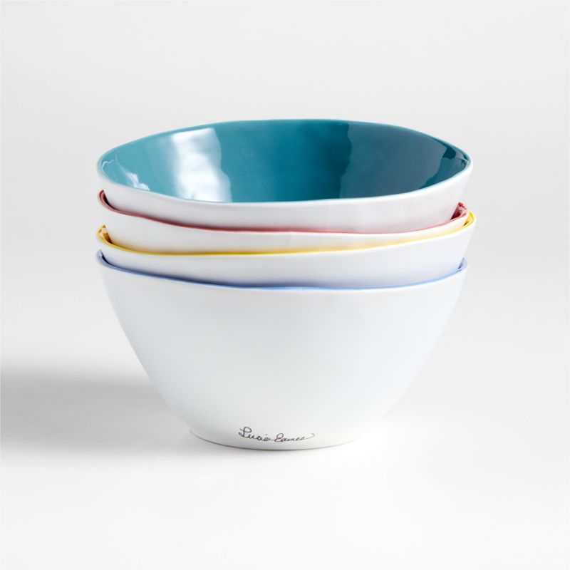 Start the morning on a vibrant, optimistic note with this set of four cereal bowls. Hand-glazed by skilled artisans, the hammered-texture bowls pair bright white exteriors with vivid interiors in a sprightly palette of Cyano Green, Sol Yellow, Zenith Blue and Vida Red from Lucia Eames's Sol design (from a birthday card she created in honor of her mother's 80th trip around the sun). The four durable porcelain bowls also provide a colorful backdrop for salads, ice cream, fresh fruit or a selection of snacks.
