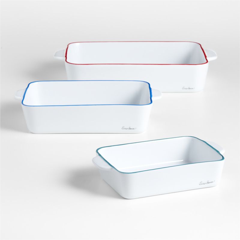 Bake an entree, side and dessert (or three fabulous desserts) in this trio of baking dishes adorned with colorful rims and hearts. Inspired by Lucia Eames's Sol design (from a birthday card she created for her mother's 80th trip around the sun), the three bakers celebrate the icon's playful designs. Bright white glaze coats the porcelain dishes, each outlined in Cyano Green, Zenith Blue or Vida Red. Hearts in the same hues—one on the small baker, two on the medium and three on the large—add a sweet surprise as you serve. We love this nesting set as a joyful gift for hosts and bakers.