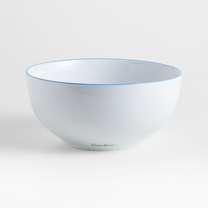 Mix up frosting, whip meringue or serve a salad in this mixing bowl adorned with a sprinkling of colorful hearts and a bright rim. Inspired by the hearts in Lucia Eames's Sol design (from a 1986 birthday card she created for her daughter), the medium bowl celebrates the icon's playful artwork. The hand-glazed white bowl is decorated in Zenith Blue and Vida Red. We love the sweet surprise of dancing hearts on the interior that are revealed once the bowl is empty.