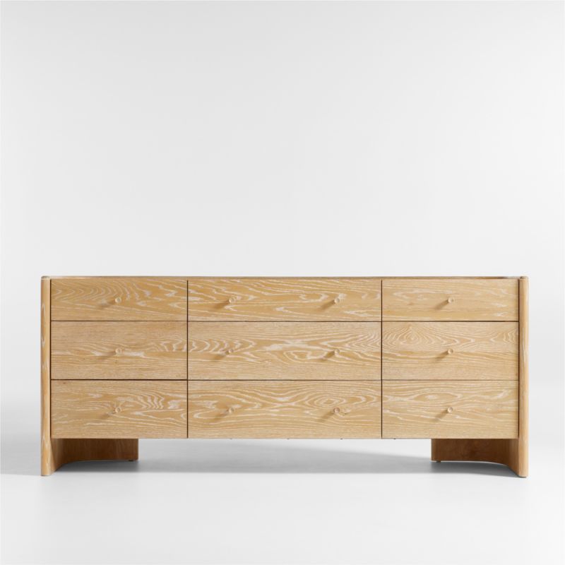 Ivory ceruse and graceful curves bring oak's cathedral graining to the fore in our Soleri dresser. Softened by bull-nose edges, the frame scoops round from the back to float a central set of drawers in its embrace. Seamless drawer fronts are dotted with tapered wood pulls. The Soleri nine-drawer oak wood dresser is a Crate & Barrel exclusive.