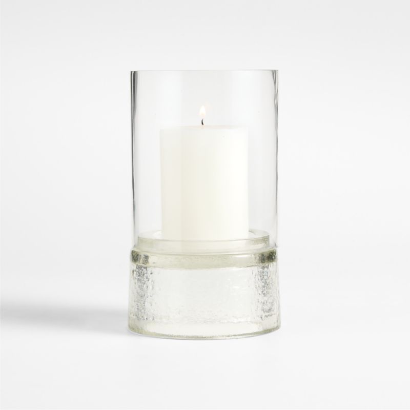 Our Solstice candle holder showcases serious artisanship. Skilled craftspeople blow clear glass into a cylinder before polishing it by hand and elevating it upon a hand-molded, richly textured base. We love the way the hollow base gives the illusion of thick, solid glass. The small hurricane elevates pillars to create a tiered candlelight display, especially paired with its larger counterpart.