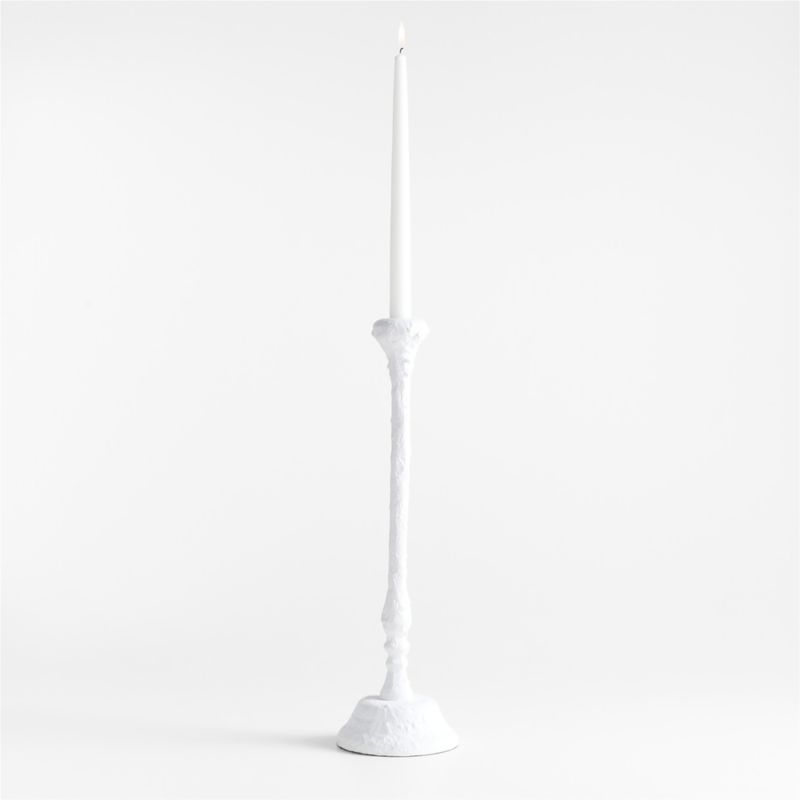 Our Sonara taper holder fascinates with the look of a plaster or papier-mache found object. Actually crafted of cast aluminum with a matte white finish and plenty of texture, the small candlestick has an evocative vibe that we adore. Pair with the other pieces in our Sonara collection for an atmospheric dining table display.