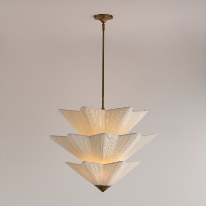 Inspired by a ballgown glimpsed in a dimly lit villa, the Sonja chandelier epitomizes understated drama. The shade nests three tiers of tightly ruched white fabric, balancing confident angularity with delicate softness. The draped gauze diffuses light beautifully, casting a golden glow on the burnished brass fixture. A conical finial provides the perfect final touch of glamour.
