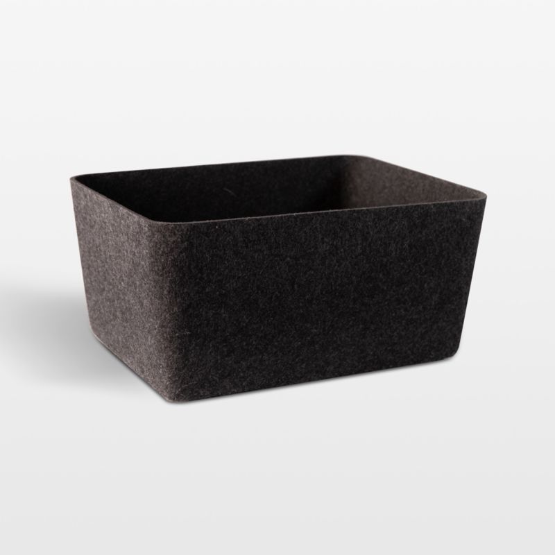 Storage with a touch of softness. This felt storage bin crafted with recycled polyester corrals everything from guest slippers to picture books to cold-weather accessories. We appreciate the display-worthy bin's structured sturdiness and clean, sculpted curves in any room of the house. The heathered black hue showcases unique subtleties and harmonizes effortlessly with modern decor. Useful on its own, the wide bin organizes beautifully in multiples on open shelving, in a linen closet or under an entryway bench.