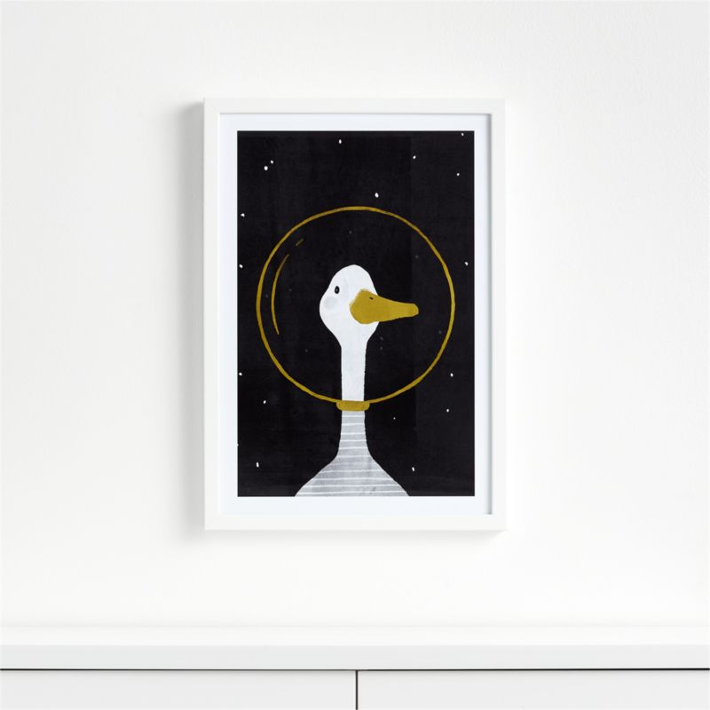 This Space Goose Framed Wall Art takes one giant leap for kids room decor. A friendly goose in a golden helmet and striped shirt is pictured against a starry outer space background. Ideal for mini animal lovers and astronauts-to-be, it's a fun pick for your kid's gallery walls that will bring a hint of humor to any space in the home.