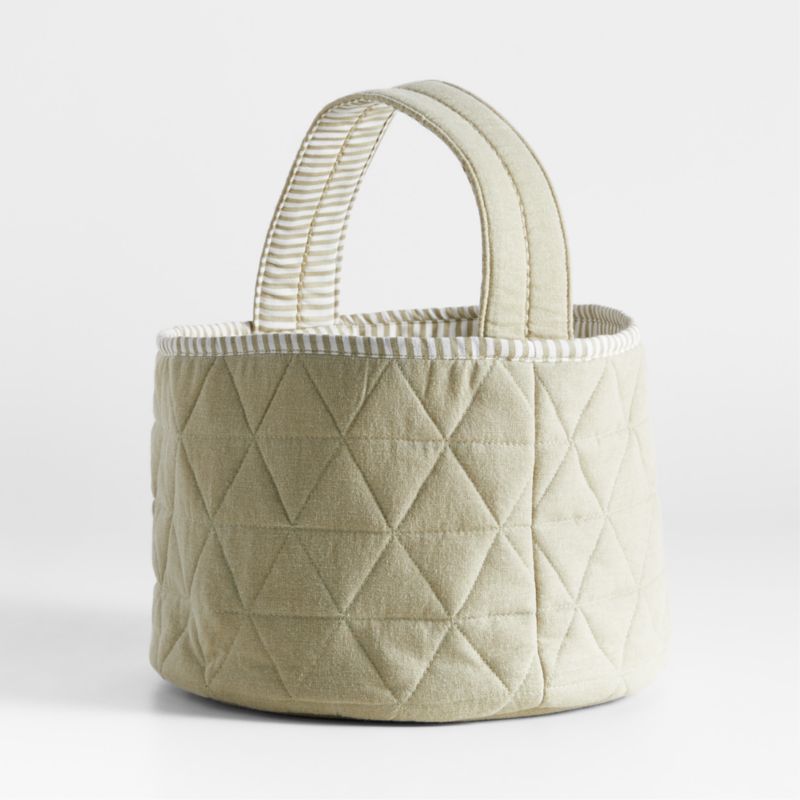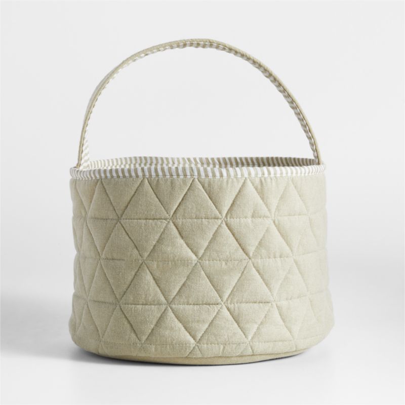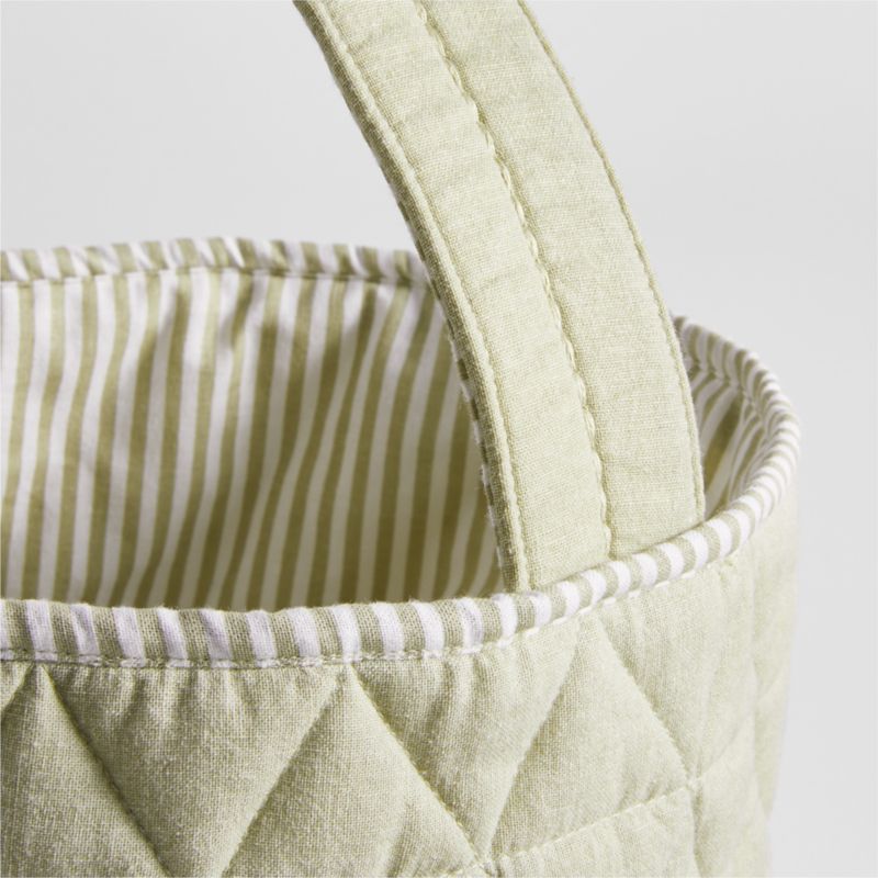 Bring smiles to little ones' faces with our Spanish Moss Green Quilted Easter Basket, ready to be filled with eggs, treats and other holiday surprises. Delightfully detailed with a triangle stitch pattern and pinstriped lining, this soft, washed cotton basket is designed to last for many egg hunts to come. It even doubles as a playful storage bin in the off-season.