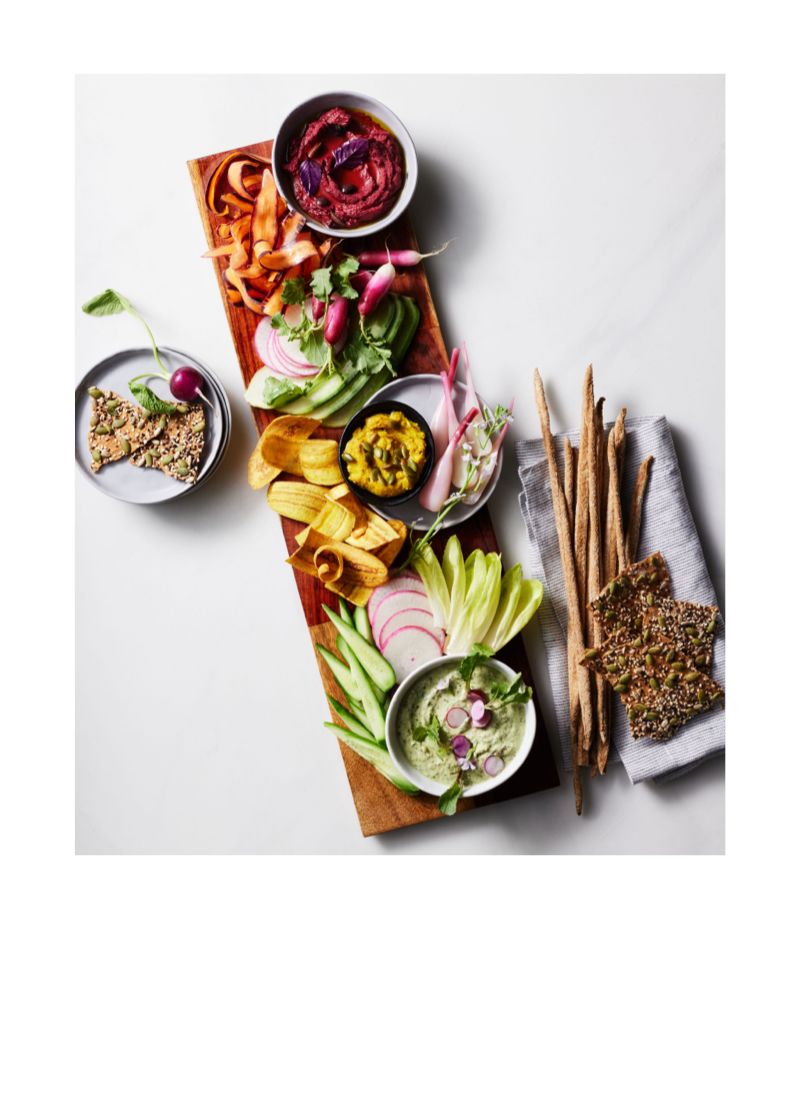 Color brings this plant-based board to life with a varietyof dips, veggies, & fruits—the more, the better.