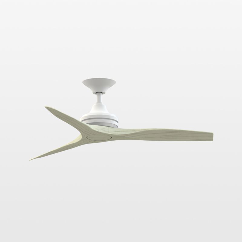 Inspired by a vintage propeller, this sophisticated fan brings its understated good looks to any room, indoors or out. The remote-controlled ceiling fan offers three speeds and reverses for seasonal use—counterclockwise in the summer, clockwise in the winter. Finished in fresh white, Spitfire's streamlined metal fixture supports three dynamically curved blades carved of light oak. This modern, versatile fan is damp rated for installation in indoor as well as covered outdoor spaces.
