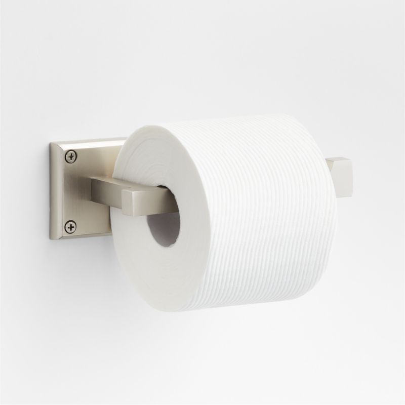 Sometimes it's the small things that pull a room together. That's why we've designed a hardware collection with modern silhouettes, clean lines and a touch of tradition to give your bathroom that perfect finishing touch. Rounded corners and smoothed edges soften the minimalist design of the toilet paper holder made of brass finished in brushed nickel. The open-ended design makes it easy to load a roll of toilet paper, and the mix of square and rectangular shapes gives the holder a geo-forward look that's bold and contemporary. The fixture is ready to mount on the wall with included hardware.