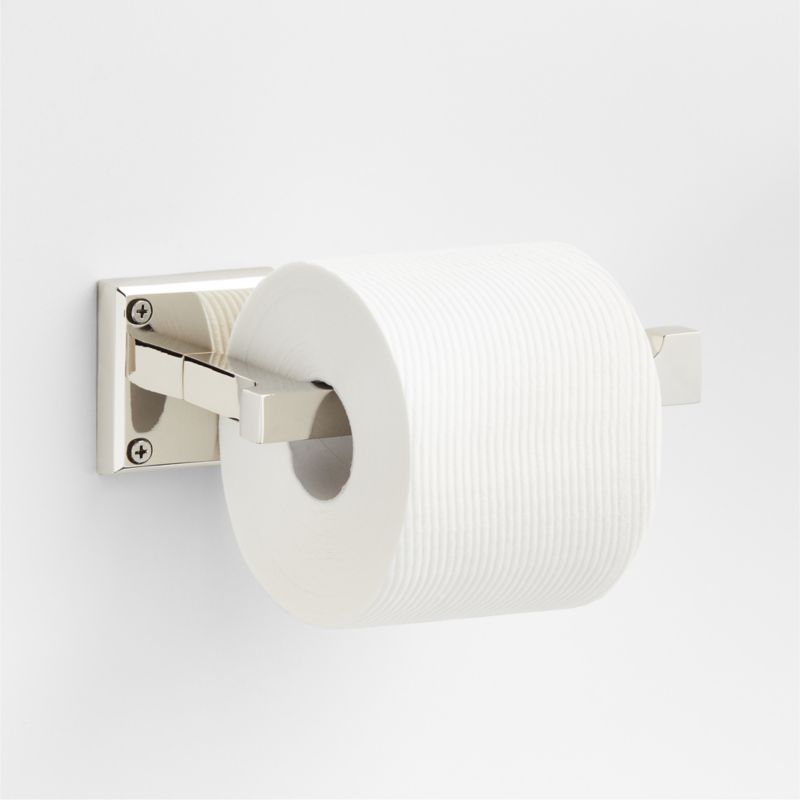 Sometimes it's the small things that pull a room together. That's why we've designed a hardware collection with modern silhouettes, clean lines and a touch of tradition to give your bathroom that perfect finishing touch. Rounded corners and smoothed edges soften the minimalist design of the toilet paper holder made of brass with a polished chrome finish. The open-ended design makes it easy to load a roll of toilet paper, and the mix of square and rectangular shapes gives the holder a geo-forward look that's bold and contemporary. The fixture is ready to mount on the wall with included hardware.