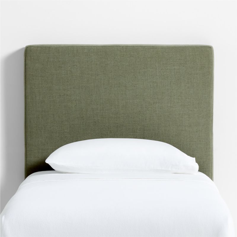 Instantly elevate dorm room comfort and style with this charging headboard upholstered in sage green linen-blend fabric. Squared off with a modern organic look, the generously padded wall headboard creates a serene spot for studying, reading and lounging. An integrated port with standard and USB outlets provides plenty of spots to plug in a phone, tablet, alarm clock and more. Perfectly sized for dorm beds, the twin headboard attaches to the wall securely with adhesive strips or metal hanging hardware.