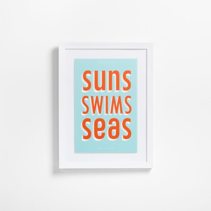 Endless summer vibes? Count us in. Created in collaboration with the design authorities at Domino, this framed wall art makes a stylish splash by using bold, three-dimensional typography to list a few of our favorite things: suns, swims, and seas. Srsly, is that too much to ask for? Printed in beachy-keen hues of orange, white and turquoise, the art floats in a white wood frame.
