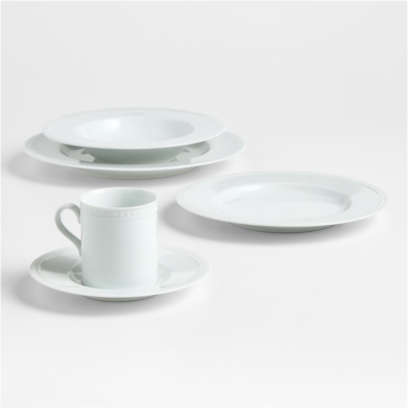 Includes dinner plate, salad plate, low bowl, cup and saucer