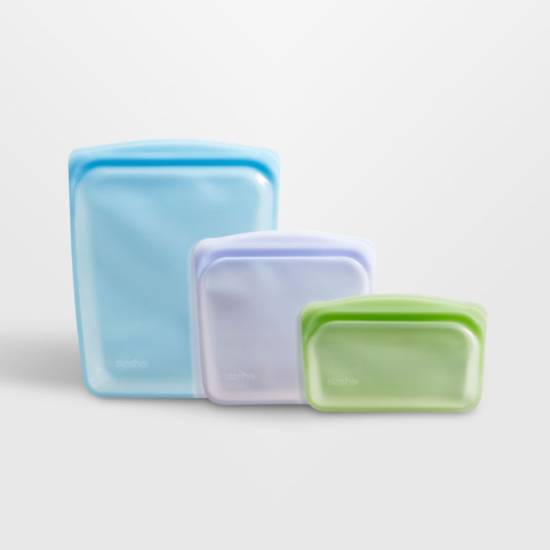 Stash everything from chargers to a sandwich to toiletries in this set of sturdy resealable bags. Free of petroleum, the colorful platinum silicone sacks seal tightly, can be written upon and are touch-screen compatible. Stasher reusable silicone bags clean up easily in the dishwasher time after time and are safe to use in the freezer, microwave, sous vide and oven. This handy three-piece set includes a green snack bag, lavender sandwich bag and blue half-gallon bag.