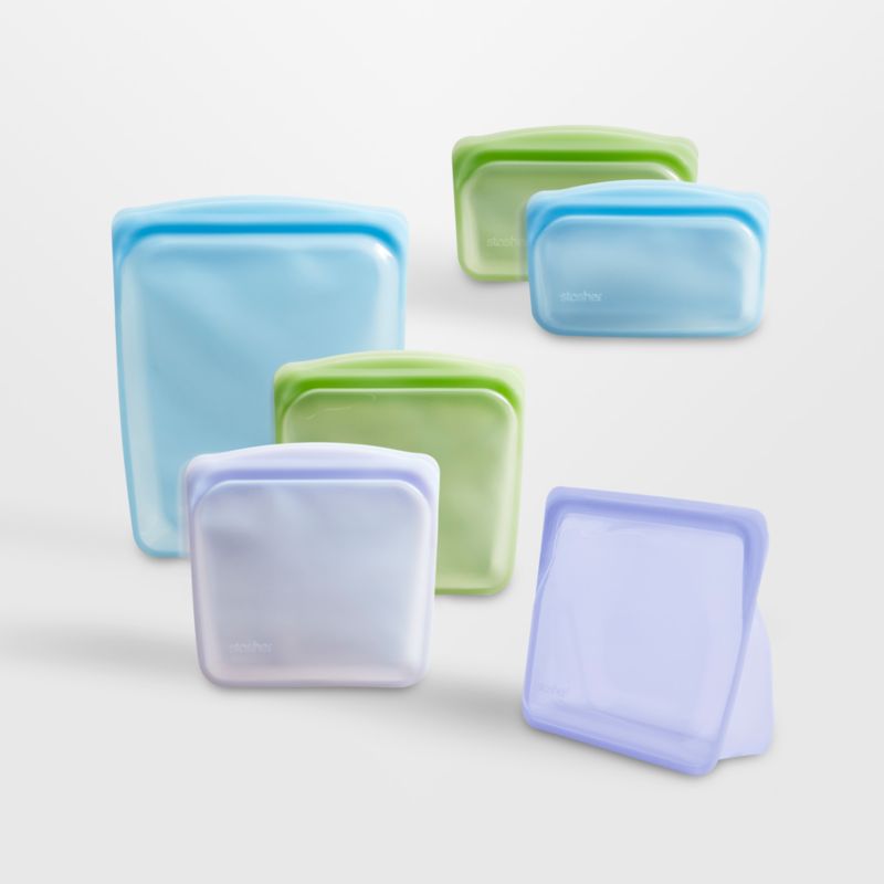 Stash everything from frozen berries to salads to craft supplies in this set of sturdy resealable bags and bowls. Free of petroleum, the colorful platinum silicone sacks seal tightly, can be written upon and are touch-screen compatible. Stasher reusable silicone bags clean up easily in the dishwasher time after time and are safe to use in the freezer, microwave, sous vide and oven. This handy six-piece set includes blue and green snack bags, green and lavender sandwich bags, blue half-gallon bag and a lavender two-cup bowl.