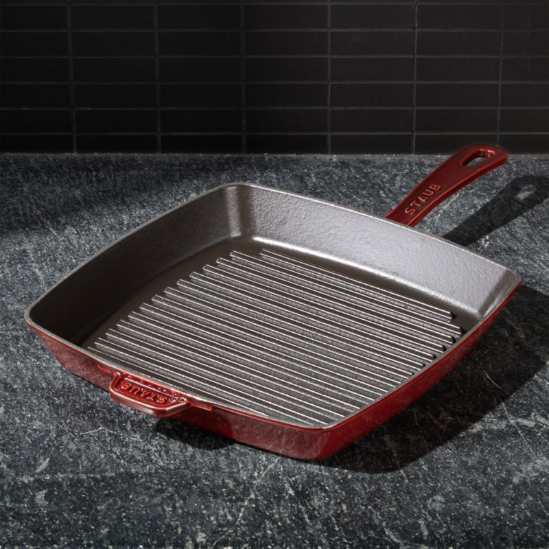 Preferred by some of the world's greatest chefs, French-made Staub cookware is renowned for its superior heat retention and oven-to-table good looks. Made of cast iron with a dark red, chip-resistant enamel coating, this grill pan retains heat beautifully and can be used on an outdoor grill as well as a stovetop burner. Ridges on the bottom sear grill marks into food, while the rough texture provides exceptional browning.