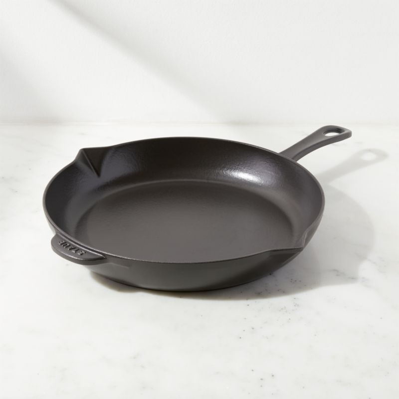 Preferred by some of the world's greatest chefs, French-made Staub cookware is renowned for its superior heat retention and oven-to-table good looks. Enameled in chic matte black, this cast iron frying pan distributes heat evenly over the entire base of the pan right up to its edge. Its signature matte-black enamel interior intensifies the natural flavor of food for delicious frying and sauteing, plus it's scratch resistant and easy to clean.