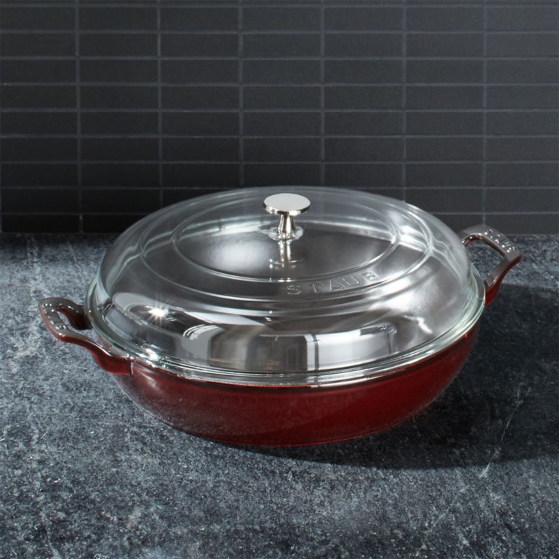 Preferred by some of world's greatest chefs, French-made Staub cookware is renowned for its superior heat retention and oven-to-table good looks. Made of enameled cast iron, this covered braising pan cooks evenly and efficiently and has a glossy deep red enamel coating that resists chipping. Its signature matte-black enamel interior excels at braising, roasting and caramelizing, and is scratch resistant and easy to clean.