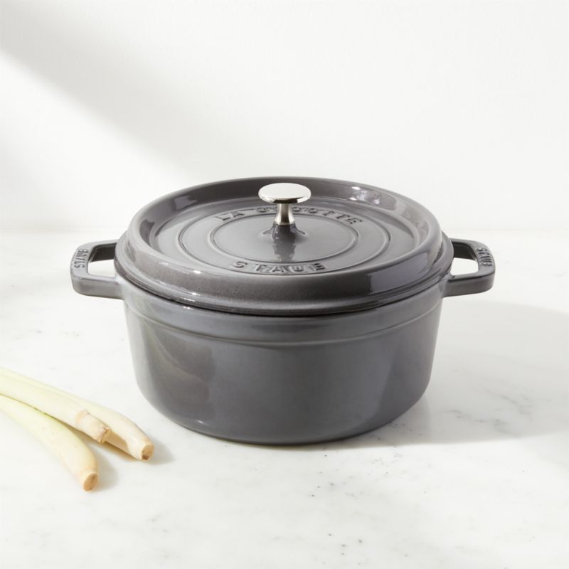 Preferred by some of the world's greatest chefs, French-made Staub cookware is renowned for its superior heat retention and oven-to-table good looks. Made of enameled cast iron, each piece cooks evenly and efficiently and has an attractive enamel coating that resists chipping. Its signature matte-black enamel interior excels at braising, roasting and caramelizing, and is scratch resistant and easy to clean. The round cocotte, in graphite grey, is ideal for cooking fish, braising and browning meats and preparing soups and stews. To ensure moist and flavorful results, the spiked lid is designed to create a rain-forest effect that returns juices back on the food, providing continuous, natural basting.