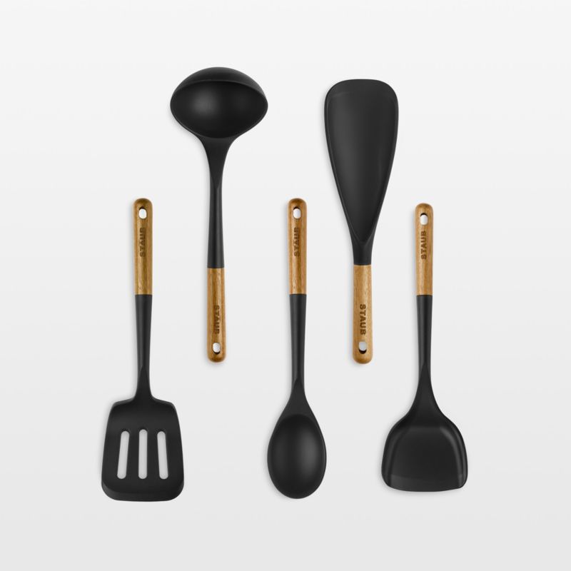 From the premium cookware company Staub, this five-piece utensil set outfits your kitchen with versatile tools for effortless cooking and serving. Made with acacia wood handles stamped with the company name, the utensils feature heat-resistant silicone heads in matte black and can be used with any type of cookware, including non-stick. The set includes a multipurpose spoon, soup ladle, wok turner, serving turner and serving spoon.