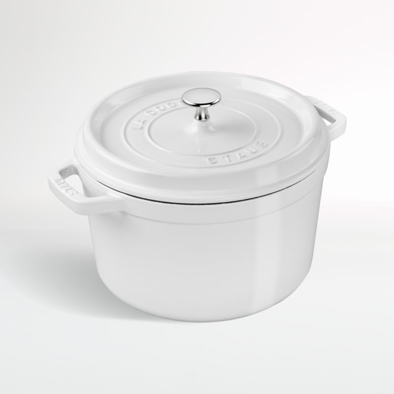Preferred by some of the world's greatest chefs, French-made Staub cookware is renowned for its superior heat retention and oven-to-table good looks. Made of enameled cast iron, this cocotte cooks evenly and efficiently and has a creamy white enamel coating that resists chipping. Its signature black enamel interior excels at braising, roasting and caramelizing, and is scratch resistant and easy to clean. The tall round Dutch oven is ideal for braising and browning meats or preparing chicken korma, asparagus risotto and jambalaya for the whole household. To ensure moist and flavorful results, the spiked lid creates a rain-forest effect that returns juices back on the food, providing continuous, natural basting.