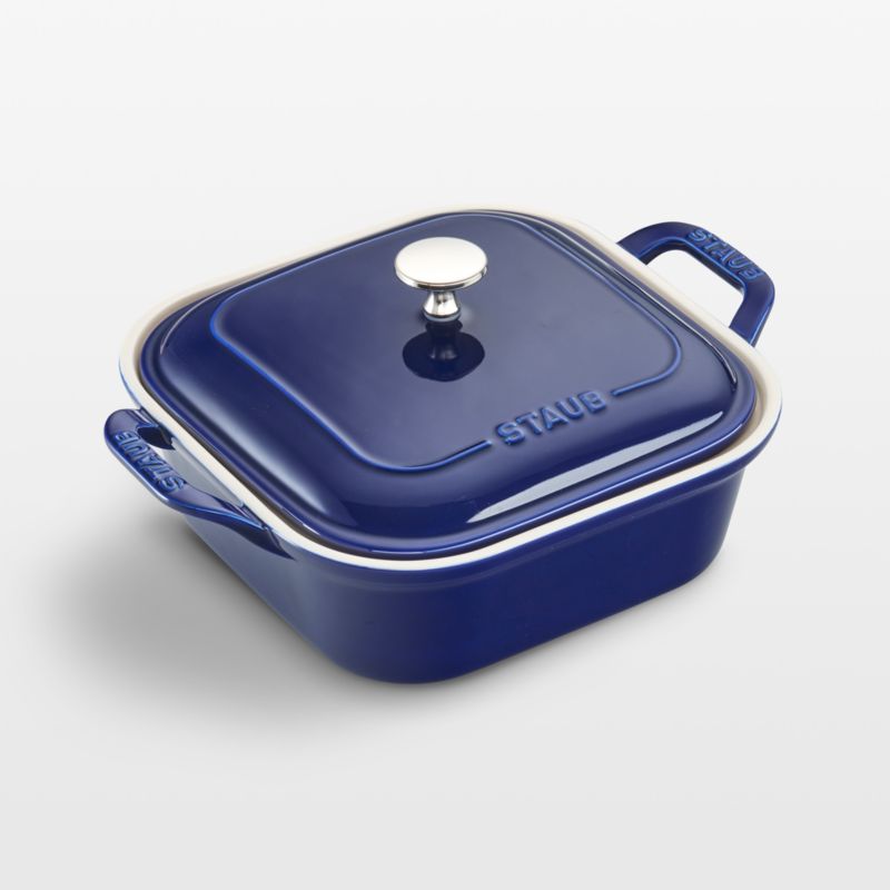 Rooted in French culinary heritage, Staub cookware is beloved by professional and home chefs for its exquisite craftsmanship, exceptional performance and timeless beauty. This square ceramic baking dish puts a pop of color in your kitchen, finished with a dark blue porcelain enamel glaze that prevents absorption of moisture during baking. Extremely resistant to impact and thermal shock, the versatile lidded casserole dish easily goes from freezer to oven to table.