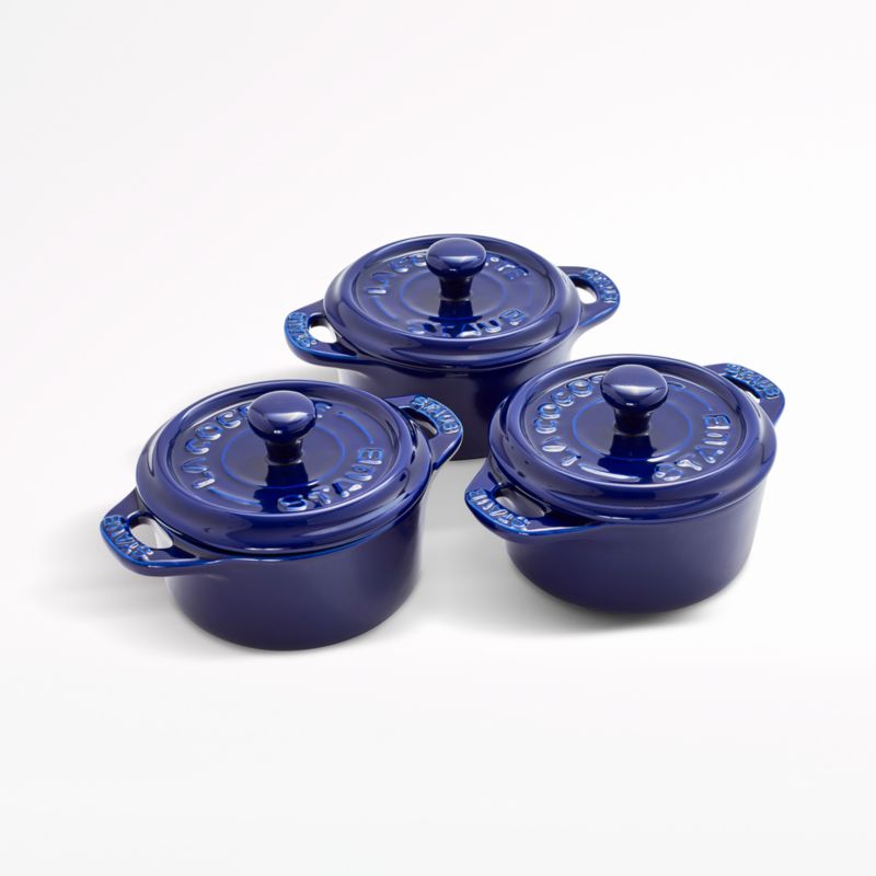 Rooted in French culinary heritage, Staub cookware is beloved by professional and home chefs for its exquisite craftsmanship, exceptional performance and timeless beauty. This trio of petite ceramic Dutch ovens puts a pop of color in your kitchen, finished with a dark blue glass-porcelain enamel that prevents absorption of moisture during baking. The three mini cocottes charmingly present diners with their very own single servings of pot pie, mushroom casserole and peach cobbler. Resistant to scratches, stains, impact and thermal shock, these lidded baking dishes easily go from freezer to oven to table to dishwasher.