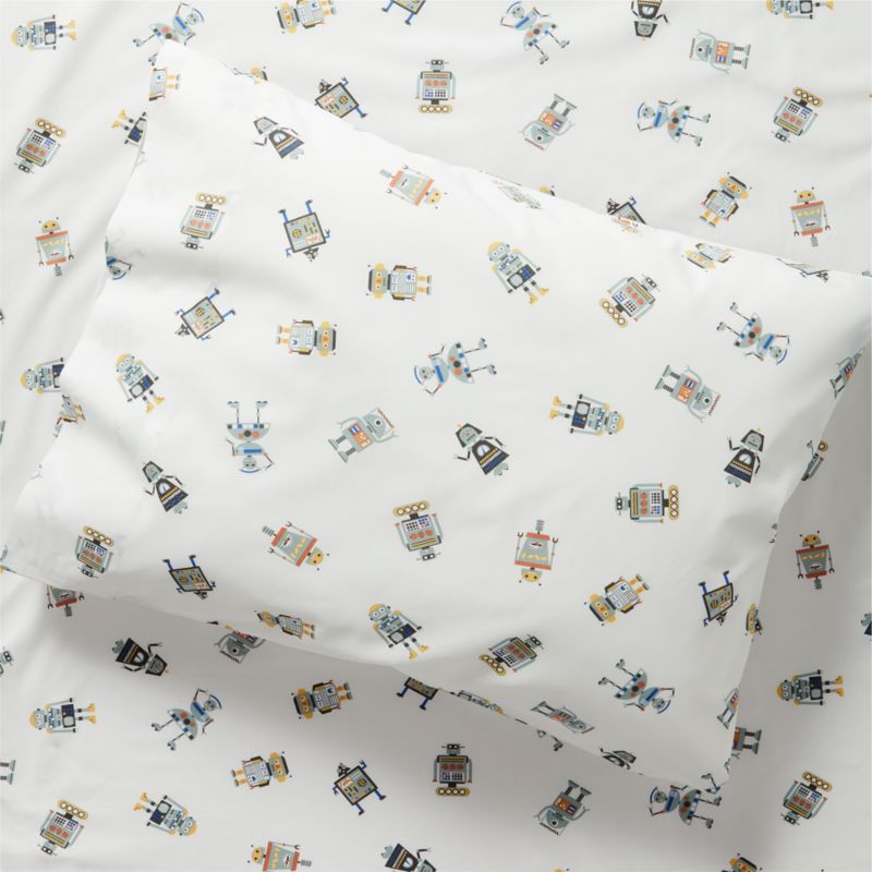 Want to get kids excited about bedtime? Layer their bed with playful sheets that embrace what they love. Friendly droids beep and bop across our Modern Robot Pillowcase, specially programmed for a comfy night's sleep in crisp, soft organic cotton percale. Complete the bedtime fun with our coordinating Modern Robot Organic Cotton Sheet Set, Quilt and Pillow Sham.