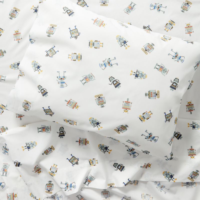 Want to get kids excited about bedtime? Layer their bed with playful sheets that embrace what they love. Friendly droids beep and bop across our Modern Robot Sheet Set, specially programmed for a comfy night's sleep in crisp, soft organic cotton percale. Complete the bedtime fun with our coordinating Modern Robot Organic Cotton Quilt and Pillow Sham.