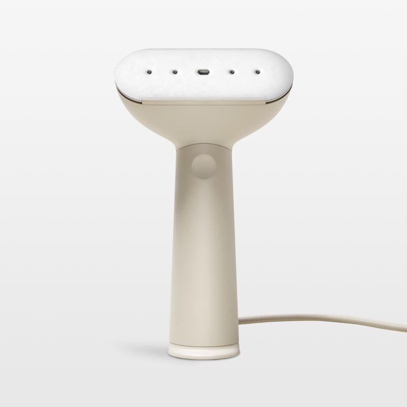 Refresh your wardrobe. This modern garment steamer smooths and freshens your clothes, curtains and bedding. Powered by hot steam with a heated ironing plate, the sleek handheld tool acts as a hybrid between an iron and a steamer to create a pressed yet natural look. The Cirrus No. 3 works efficiently, minimizes water leakage and turns off automatically. Designed with clean curves in a soft, sandy hue, the petite steamer fits easily into your suitcase so you can look your best on vacations and business trips.