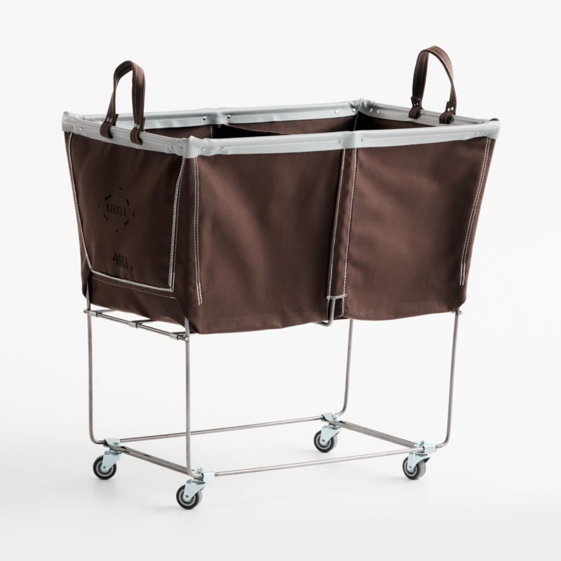 Beautify the laundry room while increasing organization and efficiency. This commercial-style divided canvas truck sorts whites and colors or cottons and delicates in a spacious partitioned bin at an ergonomic height that reduces the need to bend over. Crafted by the Steele Canvas Basket Co., the sturdy steel frame is wrapped in bourbon 100% cotton canvas with a thermal plastic rubber edge. Designed with the authentic look and feel of a professional launderer's truck, its generous 200-pound capacity can handle heavy loads up to four bushels, gliding with ease on rubber casters. Finished with the mark of heritage, the Steele logo is hand-applied using the original brass stencil from nearly a century ago when the company began producing commercial-grade canvas products.