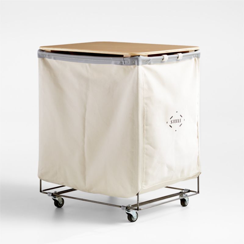 Bring commercial-style efficiency, organization and beauty to your home laundry room. This divided industrial canvas bin sorts whites and colors or cottons and delicates in a spacious partitioned laundry truck. Manufactured by the Steele Canvas Basket Co. exclusively for Crate & Barrel, the sturdy steel frame is wrapped in 100% cotton natural canvas with a thermal plastic rubber edge. Designed with the authentic look and feel of a professional launderer's bin, it glides with ease on rubber casters and holds five bushels of clothes. The wooden lid keeps the contents out of sight and allows the hamper to double as a side table or work surface for folding laundry. Imprinted with the mark of heritage, the Steele logo is hand-applied on the hamper using the original brass stencil from 1921 when the company began producing commercial-grade canvas products. Because each double laundry bin is cut, bent and welded by hand, there will be a slight variance in size.