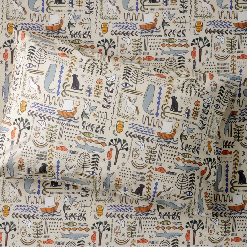 The crisp and cool organic cotton percale is emblazoned with mythological creatures and protective symbols against a neutral stone tan background. Pair it with our cozy coordinating Reminiscent quilt or Serenity duvet cover for an epic night's sleep.