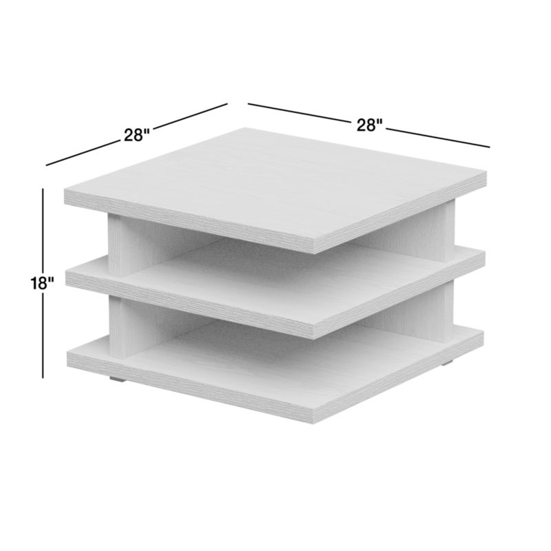 Any way you look at it, our Stria table has something to offer. The architectural design is meant to be viewed at any angle, planes offset and intersecting to create open cantilevered shelves of lengths and widths on all four sides. Made with white oak veneer that's been wirebrushed and given an ivory ceruse finish, the end table sits low yet floats on a recessed plinth and is generously sized to host a large-scale lamp and a curated selection of art books and collected objects.