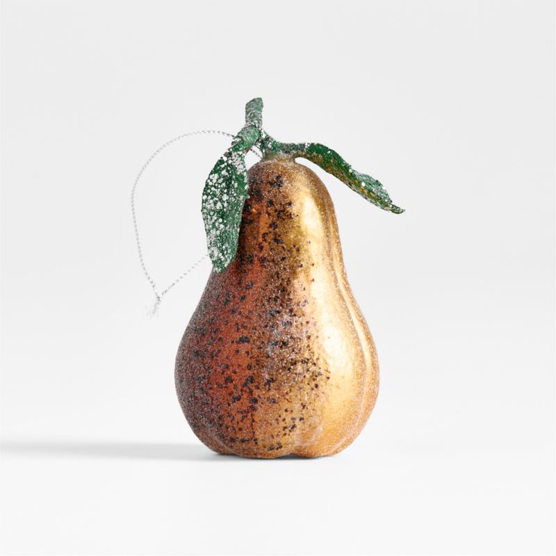 Fruit-shaped ornaments hint at the extravagant bounty of the Christmas feast, adorning the tree with delicious color and shine. Our pear is sugared with glitter that recreates the fruit's freckled skin, topped with sparkling naturalistic leaves. Add our other fruit-shaped ornaments for a tree that celebrates seasonal delights.