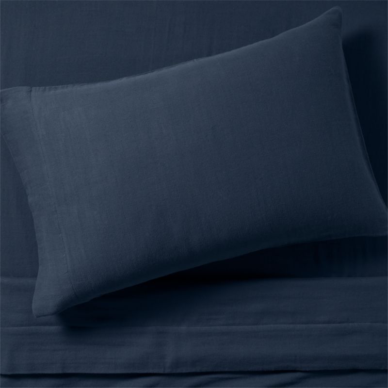 Our favorite bedding basics in dorm-friendly, extra-long sizes. This gauzy Supersoft sheet set strikes just the right balance of breathability and softness. The double-layer weaving technique creates pockets of air to hold warmth, creating irresistible coziness. Woven of organic cotton in a midnight blue hue, the extra-long twin sheet set gives dorm beds an airy, breezy look—especially when layered with other navy bedding from our Supersoft collection.