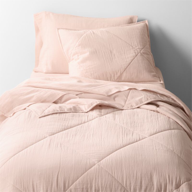 Our favorite bedding basics in dorm-friendly, extra-long sizes. This gauzy Supersoft quilt strikes just the right balance of breathability and softness. The double-layer weaving technique creates pockets of air to hold warmth, creating irresistible coziness. Quilted diamonds fluffed with recycled fill add subtle, textural pattern. Woven of organic cotton in modern pale pink, the extra-long twin quilt gives dorm beds an airy, breezy look—especially when layered with other blush bedding from our Supersoft collection.