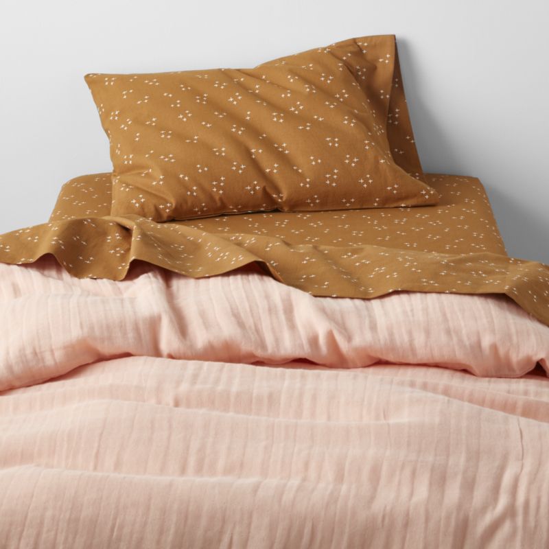 Oh-so-soft organic cotton and a soothing color palette make our mix-and-match bedding collections the best part of bedtime. Start with our Cozy Cloud Twinkle Organic Cotton Sheet Set in a starry, hand-illustrated print that adds an abundance of charm. Then layer on our Supersoft Toddler Organic Cotton Gauze Duvet Cover in a peaceful, pale pink hue. This soft, breathable collection is crafted using a double-layer weaving technique to create pockets of air that hold warmth.