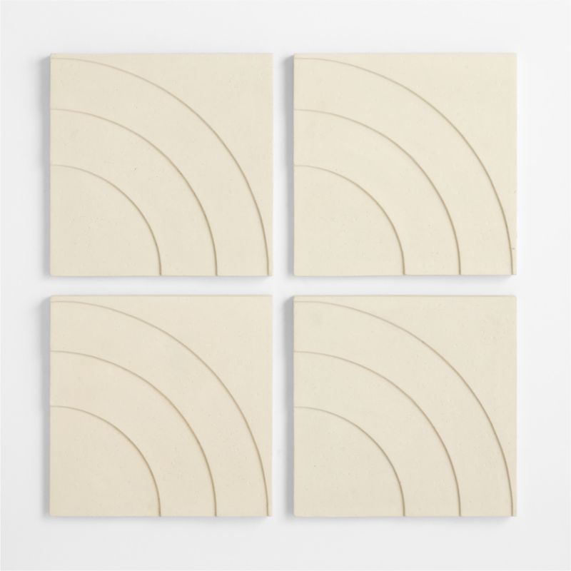 Molded from a mixture of volcanic ash, resin and fiberglass, this minimalist relief sculpture brings depth and movement to indoor and outdoor walls. The tilelayers concentric arches in a deceptively simple composition that produces an ever-changing show of light and shadow. Painted by hand in room-friendly ivory, the four square tiles in the set can be displayed in different orientations and groupings to enliven your space with dynamic, dimensional pattern.