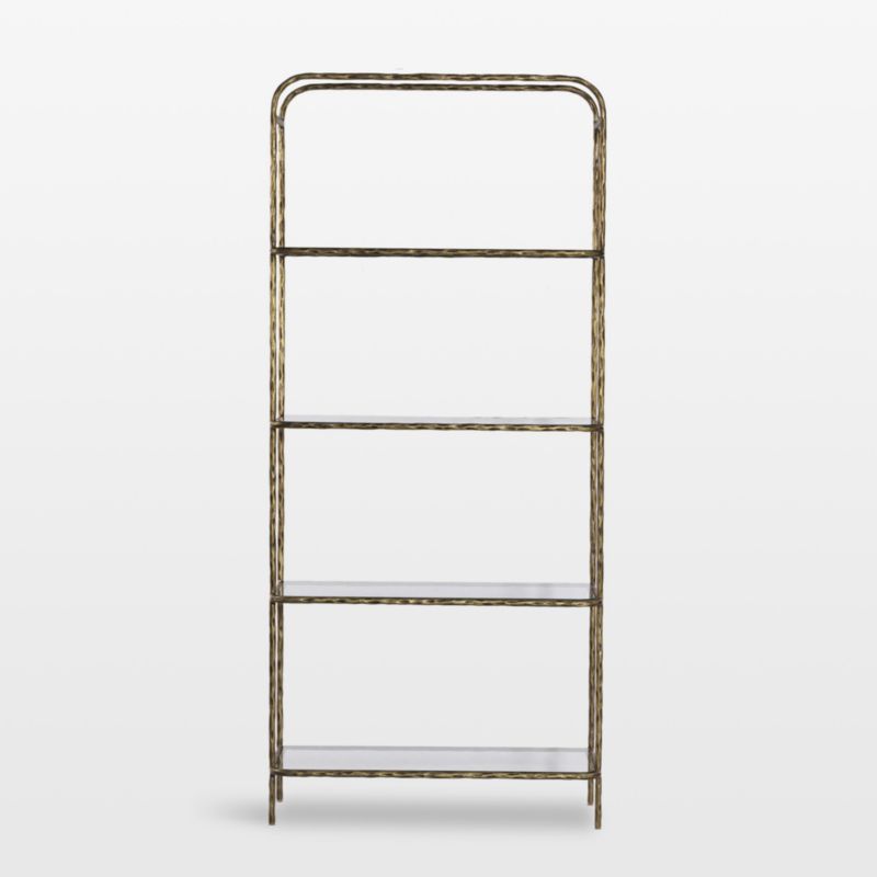 Grand in stature and airy in feel, the Swinton bookcase elevates storage and display of books, photos and collectibles. Hand finished with hammered texture and the soft glow of aged brass, the slim iron frame rises tall with arched detail at the top. Five tempered glass shelves add lightness and plenty of space to showcase prized items.