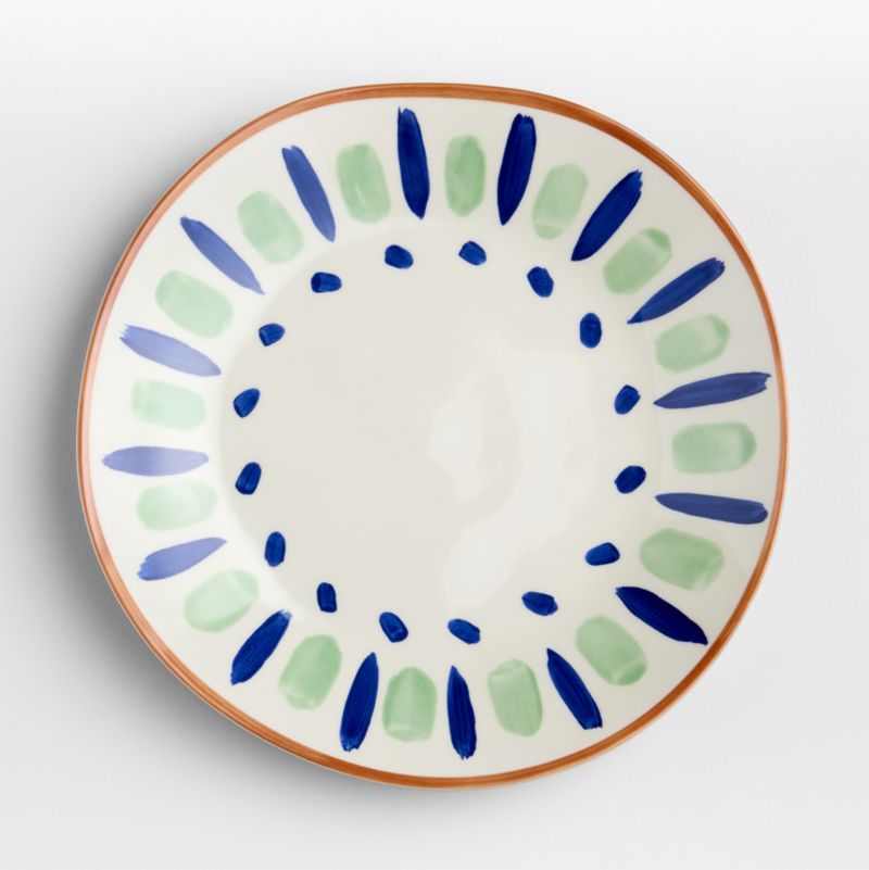 Our Taormina outdoor dinnerware emulates the casual look and breezy feel of handcrafted Mediterranean ceramics. Made of lightweight and durable melamine, the coupe-shaped dinner plate looks as if it were formed out of terracotta, glazed shiny white and handpainted with daubs and dashes of aqua and navy in a motif inspired by traditional tiles.