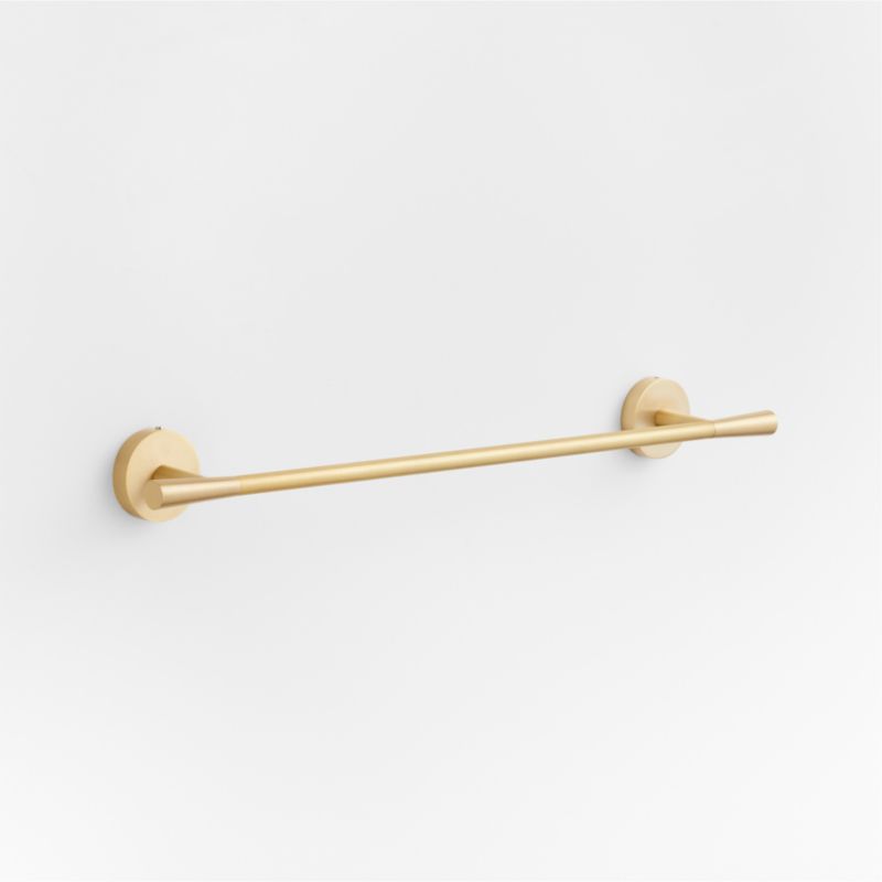 Sometimes it's the small things that pull a room together. That's why we've designed a hardware collection with modern silhouettes, clean lines and a touch of tradition to give your bathroom that perfect finishing touch. Made of brass with a brushed finish, the stylish towel bar caps the hanging rod with subtly tapered finials. Cylindrical posts anchored with scaled-up round rosette bases provide a graphic look with modern proportions. Also available in a longer length, the 18-inch towel bar is ready to be wall mounted with included hardware.